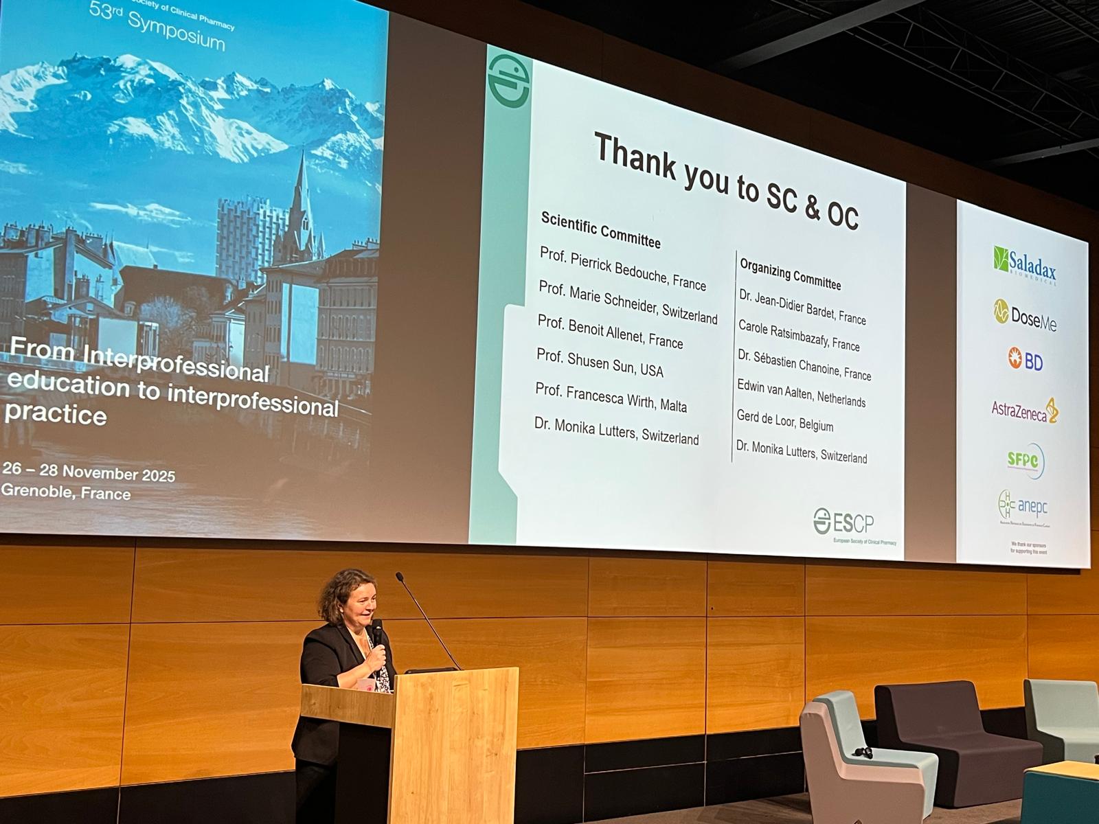 The ESCP 2025 Annual Symposium took place in Grenoble, France, from November 26 to 28, 2025, under the theme “From Interprofessional Education to Interprofessional Practice.” The event brought together over 377 participants from 44 countries across Europe and beyond, fostering the exchange of knowledge, research, and professional networking. The symposium offered a rich programme of plenary lectures, workshops, oral communications, poster presentations, and sponsored lectures, and expert discussions reflecting current challenges in healthcare — from active patient involvement and the implementation of innovations into practice, to the use of digital and AI tools in clinical pharmacy.