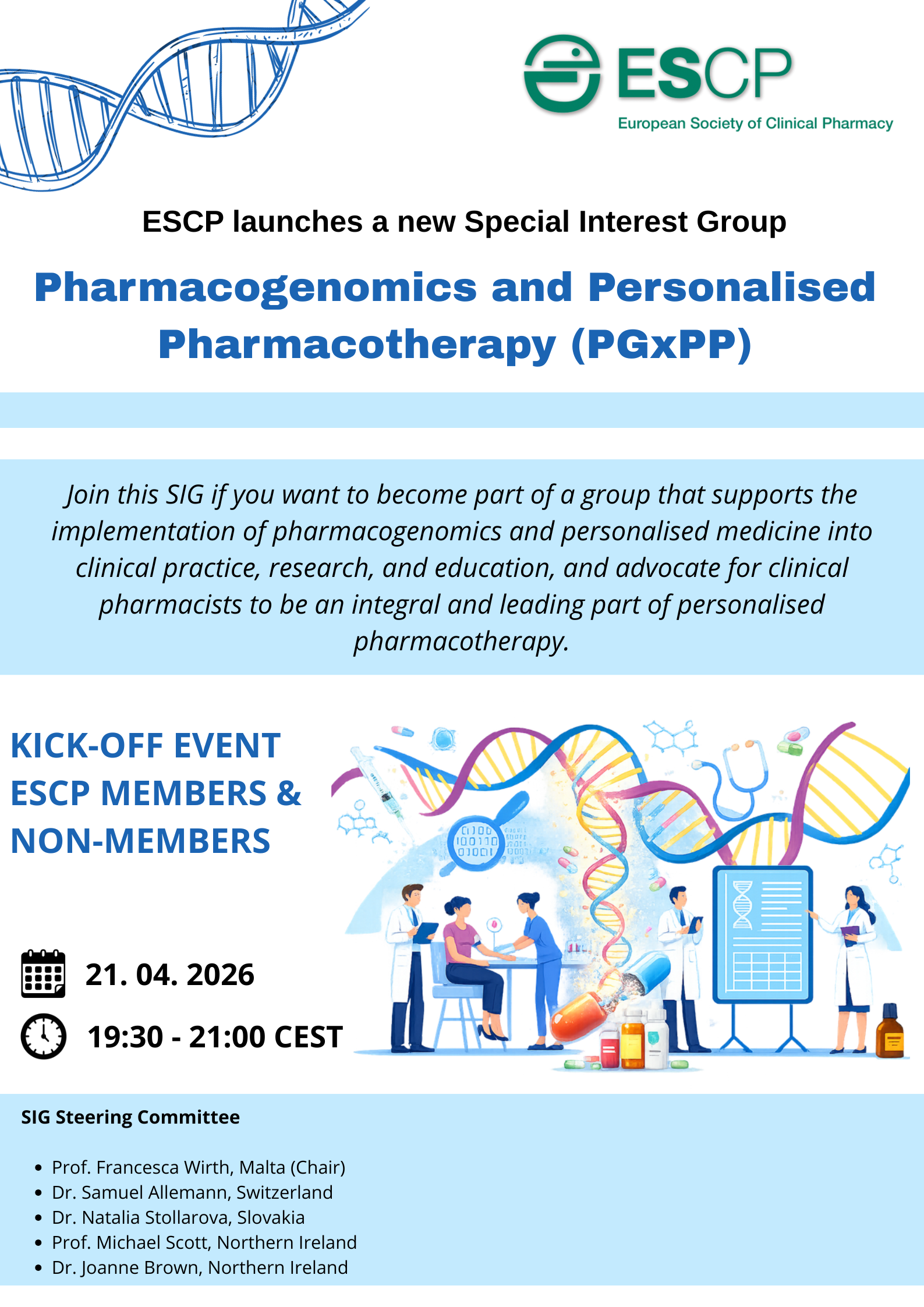 Please join the ESCP Online Kick-off Event for the new Pharmacogenomics and Personalized Pharmacotherapy Special Interest Group (PGxPP SIG). Our speakers, from across the globe, will introduce themselves as founding members and discuss the purpose and mission of PgxPP SIG to advance the responsible, practical integration of pharmacogenomic testing into clinical pharmacy practice across the globe. We also want to know what you want from this SIG.